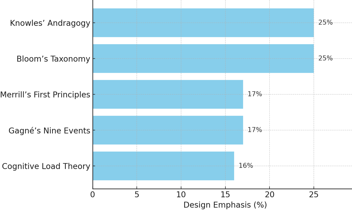 Design emphasis distributes as follows — Knowles’ Andragogy 25%, Bloom’s Taxonomy 25%, Merrill’s First Principles 17%, Gagné’s Nine Events 17%, Cognitive Load Theory 16%. This blend emphasizes real-world autonomy, higher-order judgment, and clear task scaffolding within manageable cognitive load.