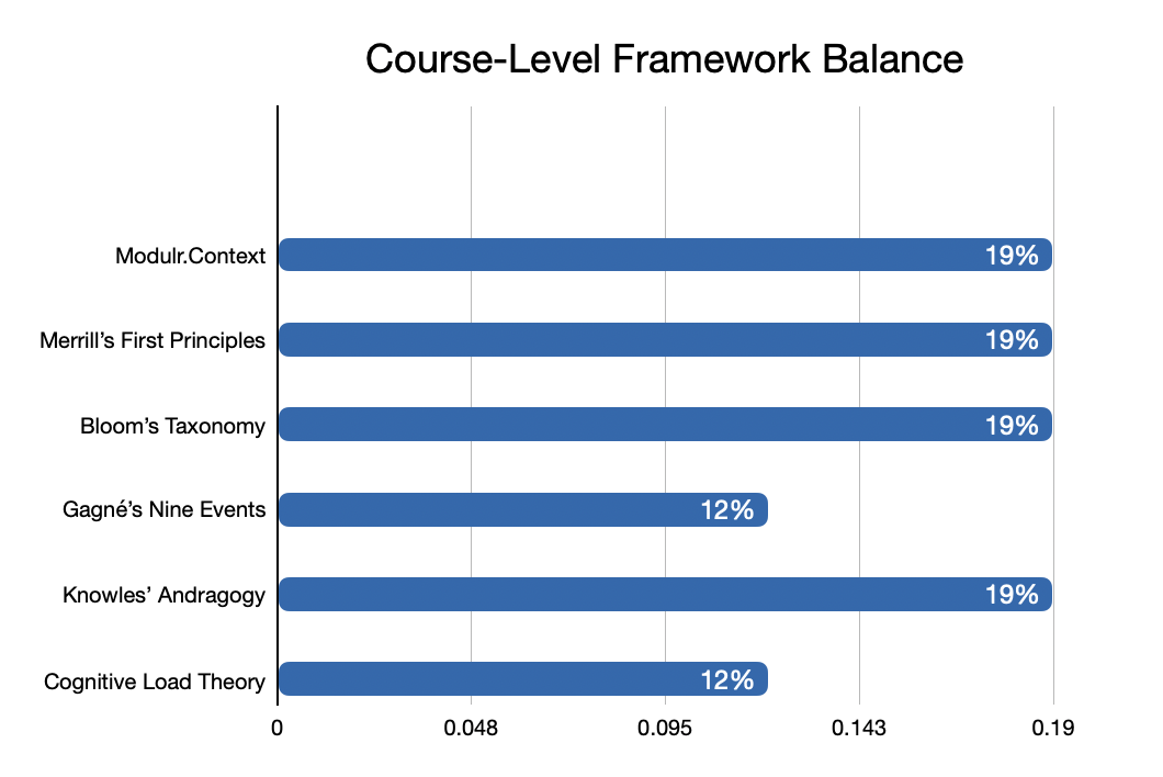 Strong framework alignment indicates the course is optimized for behavior change within tight delivery constraints.